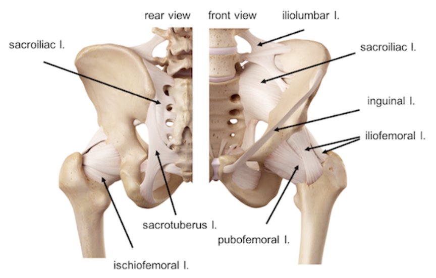 The lumbosacral ligaments are found bilaterally, connecting the inferior aspect of the transverse processes of L5 to the lateral surfaces of the sacrum
